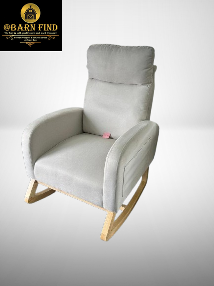 George Mason Design modern upholstered rocking chair with a wooden base.